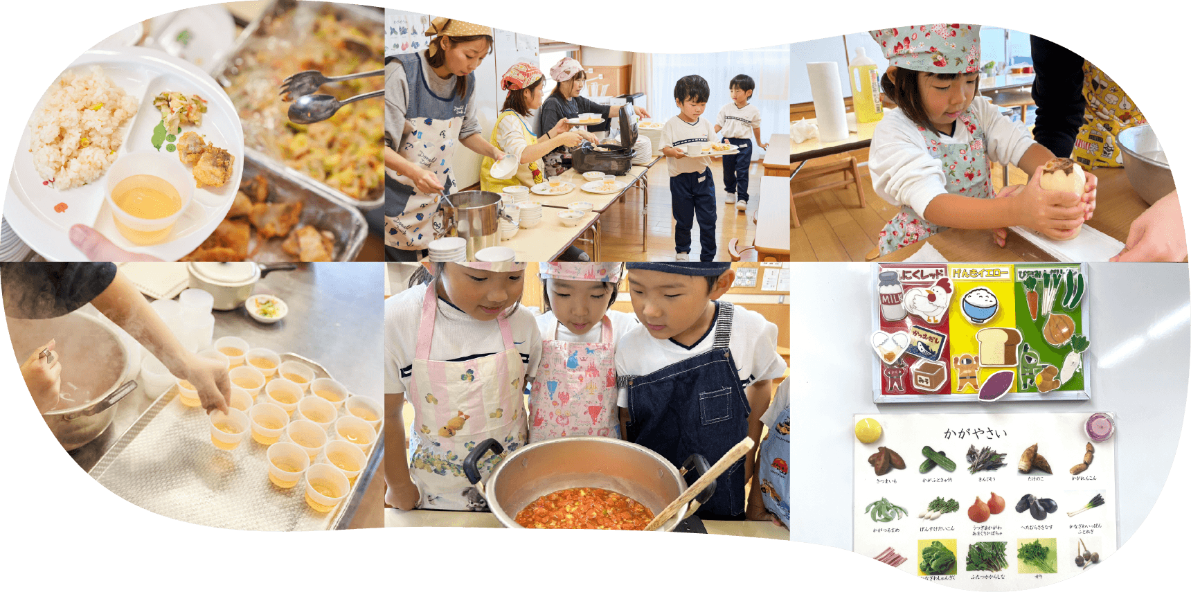 認定こども園ひょうたんは、栄養バランスを考えた献立や手作りのおやつなど、主食・副食を提供する完全給食となります。何より毎日の給食が楽しみにしてもらえる美味しい食事づくりを心掛けています。季節の食材や地元の食材を取り入れた献立は、ご家庭でも調理していただけるレシピの配布も行っています。また、食物アレルギー児や月齢に沿った離乳食も丁寧に対応しています。子どもたちの元気・笑顔の源となることを願っています。