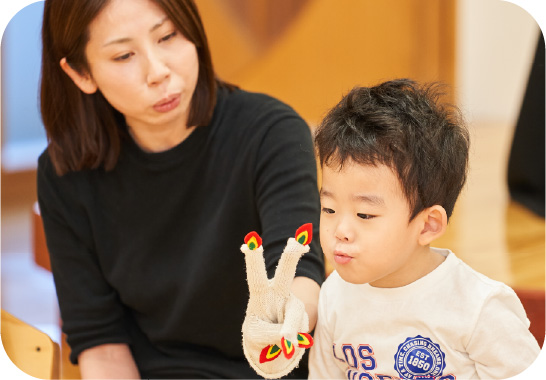 ニコラ先生と一緒に歌や絵本、会話遊びを通して英語に触れ合います。友だちと学ぶからこそ生まれるコミュニケーションの楽しさがあふれる時間です。