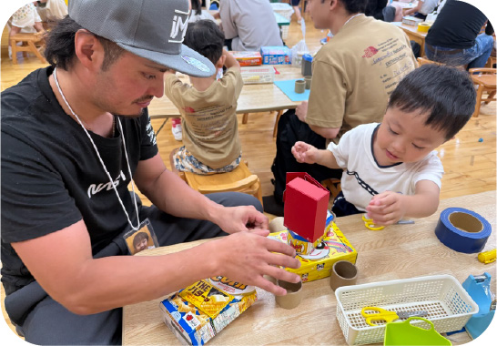 以上児、未満児それぞれ年に1度行われています。普段、お父さま同士で話し合う機会が少ないですが、雑談を交えながら気軽に子育てについて話し合うことができる場です。話し合いの他には、お子様と一緒に園の玩具に触れて遊んだり、玩具作りをしたりすることがあります。