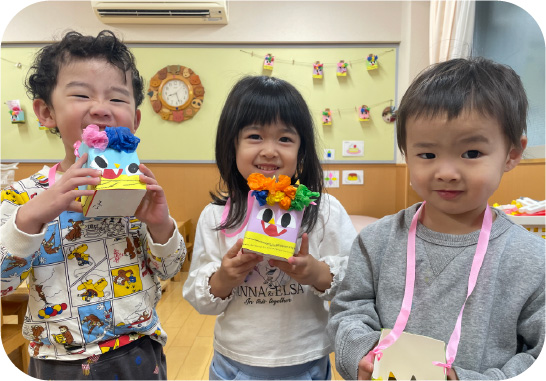 園内で行われる豆まき会です。子どもたち一人ひとりが枡を製作し、その枡を持って参加します。会の最後には鬼に扮した職員が登場してきて、みんなで無病息災を願って豆まきをします。
