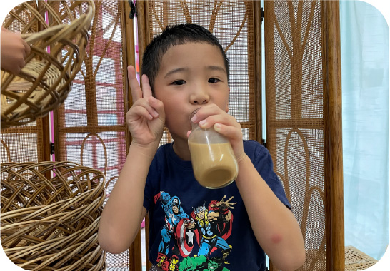 ジュースの元となるシロップ作りを3・4・5歳児で行っています。金沢で有名な近江町市場が近くに有り、年長組さんが材料を買いに行き、縦割りグループで味の違うシロップを作っています。毎日一生懸命に瓶を回して出来上がったシロップでジュース屋さんを開き、他のクラスの友だちや職員、保護者の方々に振る舞っています。